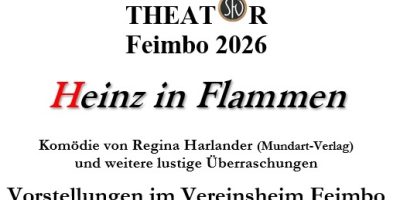 In diesem Jahr spielen die Theaterspieler die Komödie „Heinz in Flammen“ von Regina Harlander (Mundart-Verlag). Wie gewohnt dürfen sich die Besucher neben dem Hauptstück auch auf weitere lustige Sketche und kleine Überraschungen freuen, die TheaTor Feimbo seit Jahren auszeichnen.
